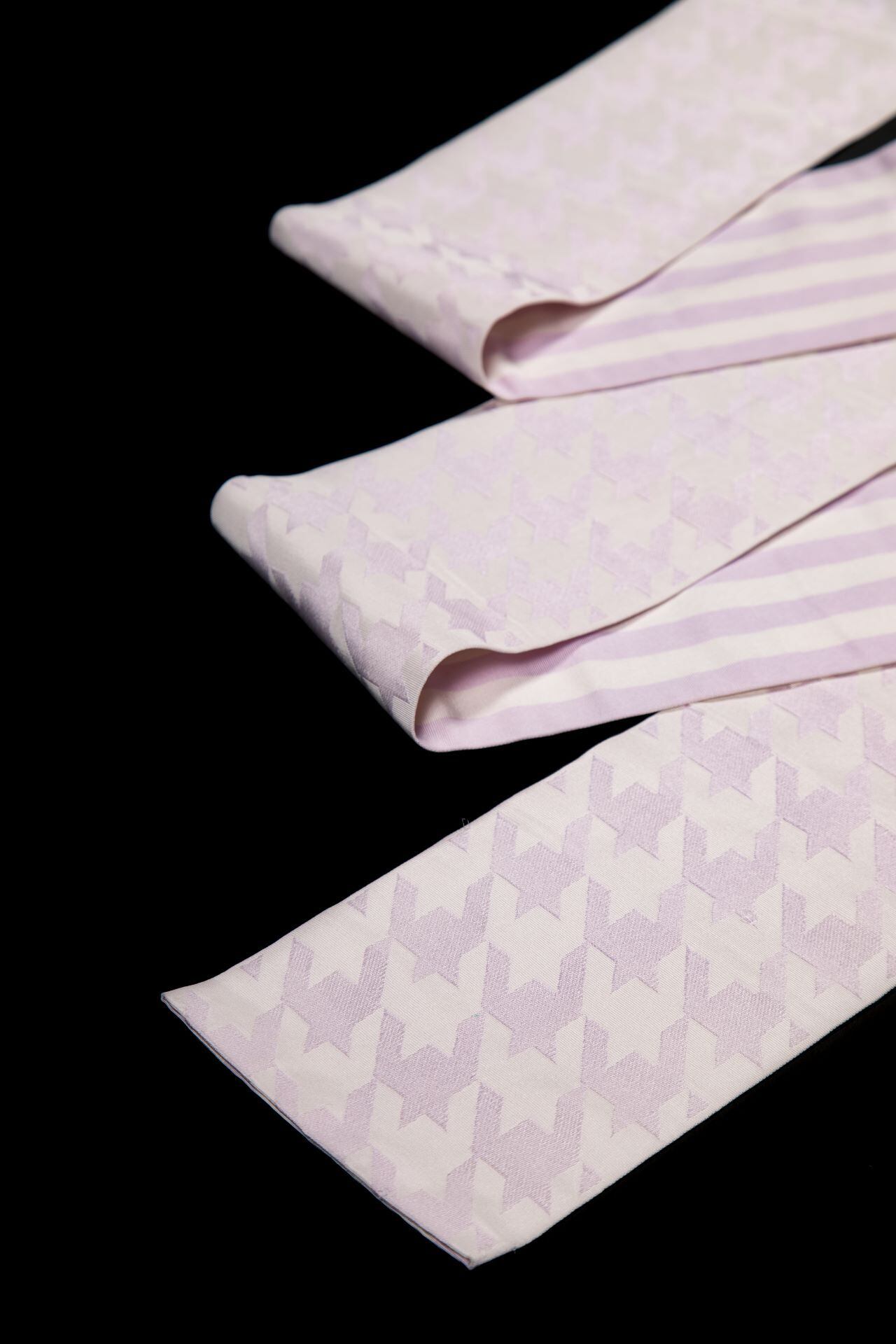 絹の光沢の美しさが引き立つ淡紅藤色×オフホワイトの優しく上品な配色で、合わせる浴衣や着物の柄を引き立てる万能な一本。
