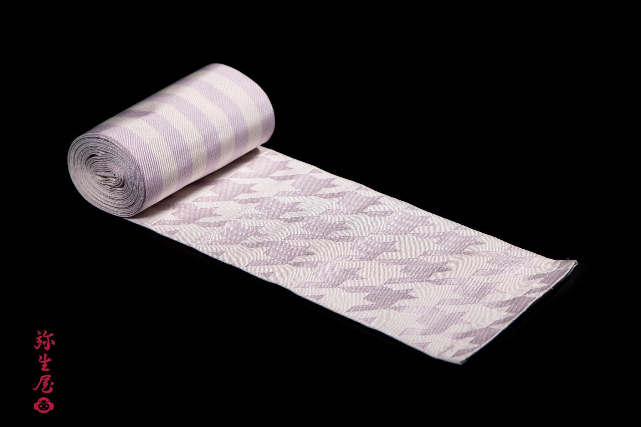 弥生屋 半幅帯 博多織 千鳥 × 横縞 ( 淡紅藤・並尺 )
